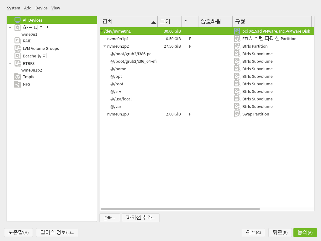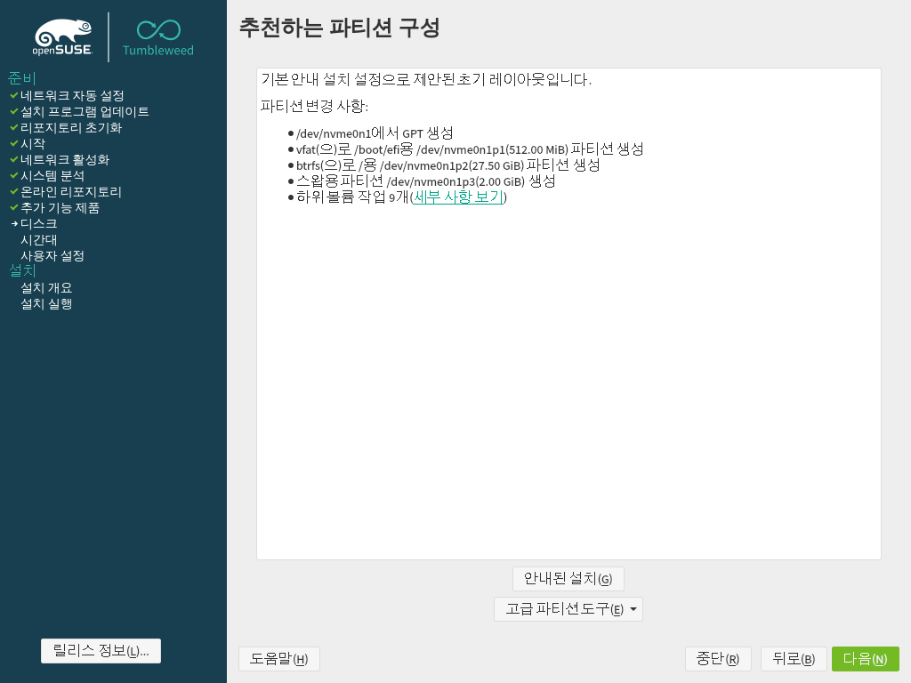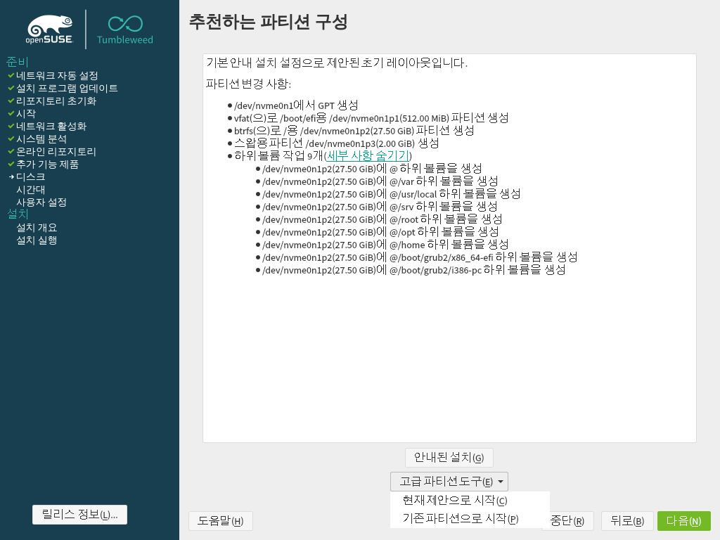 오픈수세 텀블위드 파티션을 설정할 수 있는 화면입니다. 동영상에서는 그냥 자동 설정된 상태로 진행했지만, 원하는 설정이 있다면, "고급 파티션 도구" 를 선택해서 수동으로 원하는 파티션을 구성할 수 있습니다.
