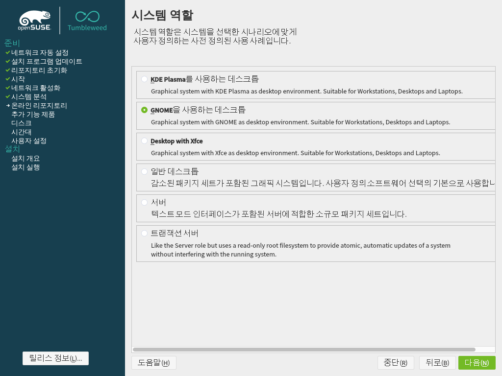 참고적으로 본문에서는 입문자를 위한 설치를 알아봅니다. 상세한 설정과 디스크 파티션을 직접 설정하셔도 무방합니다만, 이 글에서는 먼저 따라하기, 오픈수세 화면 띄우기까지 진행합니다.