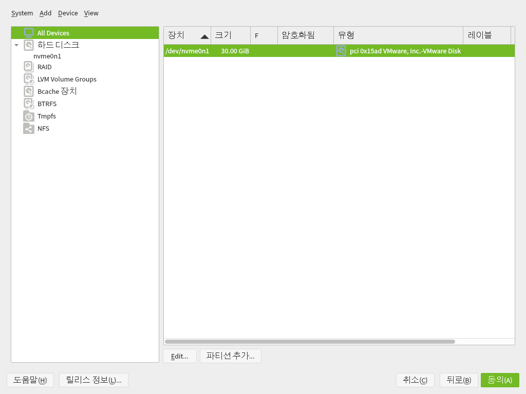 이 글에서는 '단일 디스크에서 파티션되어 있지 않은 디스크(다른 운영체제 및 데이터 없음)' 을 기준으로 설명합니다.