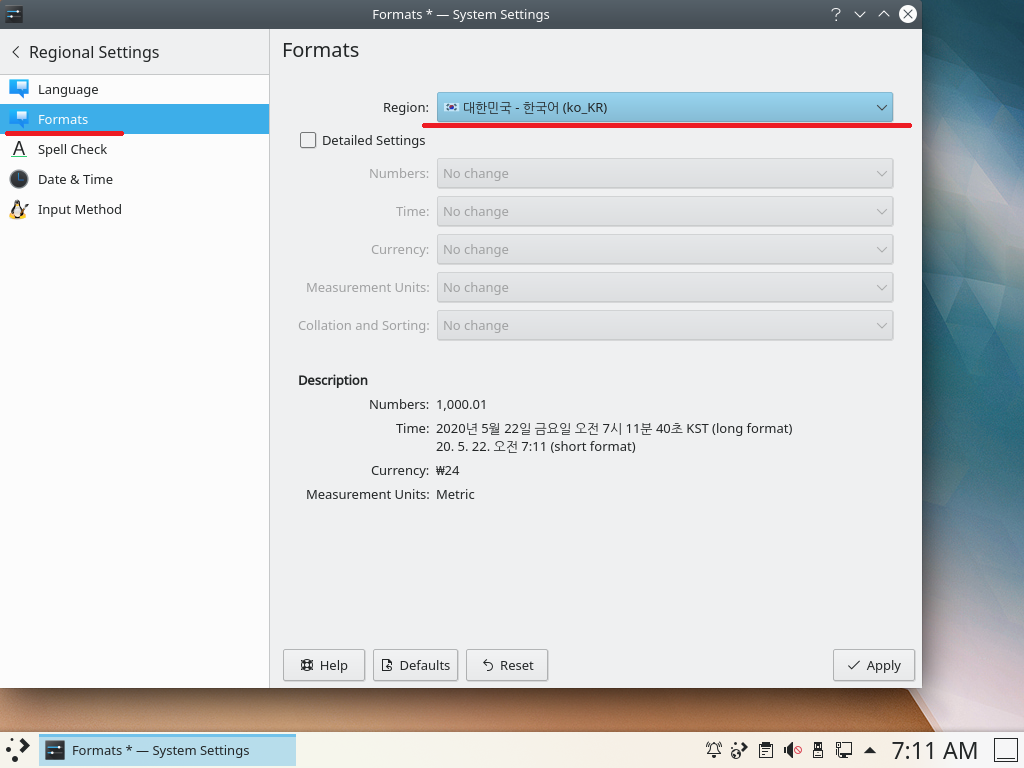 왼쪽 메뉴 중, " formats " 를 클릭하고, Region 을 "대한민국 - 한국어 (ko_KR)" 을 선택해 주고, Apply 를 누릅니다.