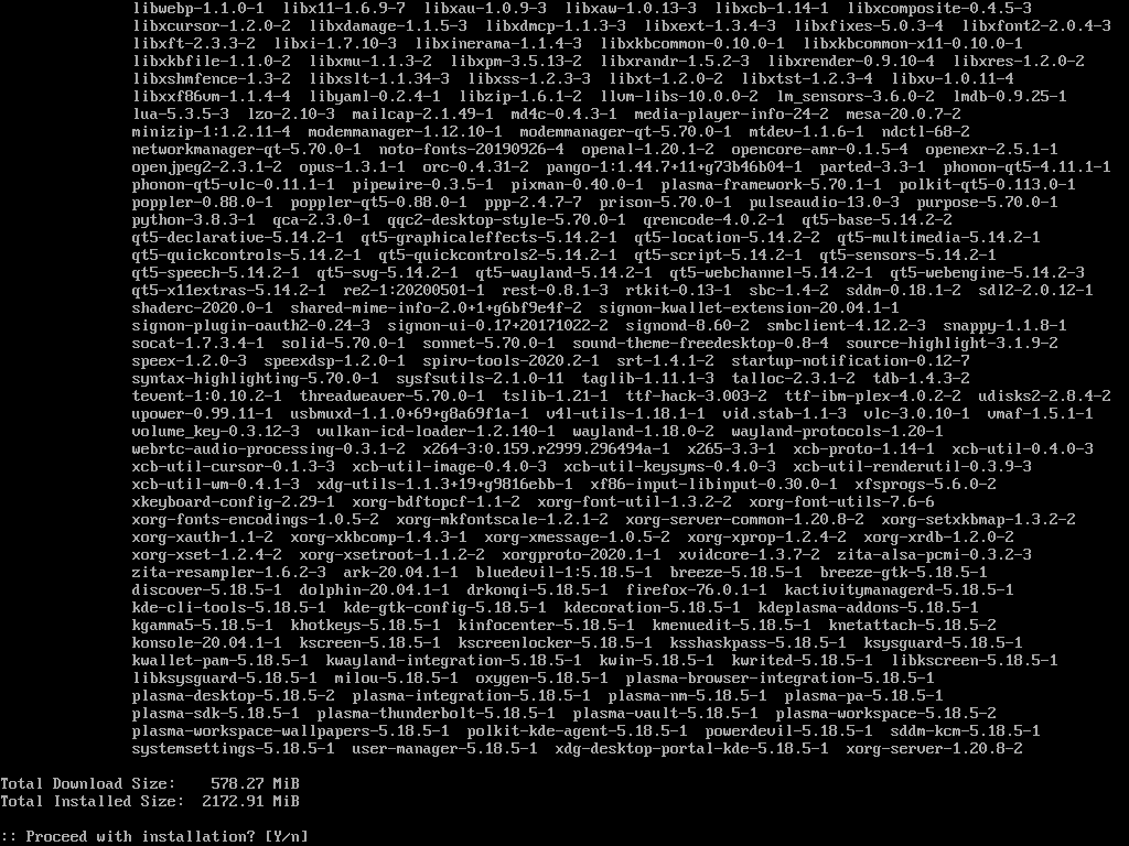 추가적으로 " kde-applications-meta " 를 추가해준다면, konsole 과 dolphin, ark 는 따로 입력하지 않으셔도 됩니다. (모두 설치하면 대략 5GB 정도의 공간이 필요합니다.)