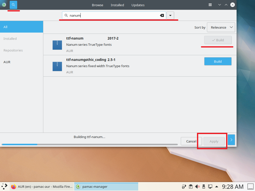 한글 설정을 위해, 왼쪽 상단의 돋보기 버튼을 클릭하시고, nanum을 검색한 후, 나눔글꼴을 설치합니다. (다른 원하시는 폰트가 있다면, 설치할 수 있는지 확인하시고, 설치합니다. (예 : noto-fonts-cjk)