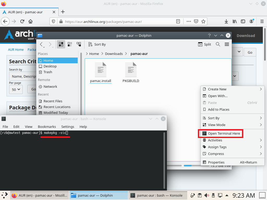 터미널이 실행되면 " $ makepkg -sic " 를 입력하면, pamac 설치가 시작됩니다.