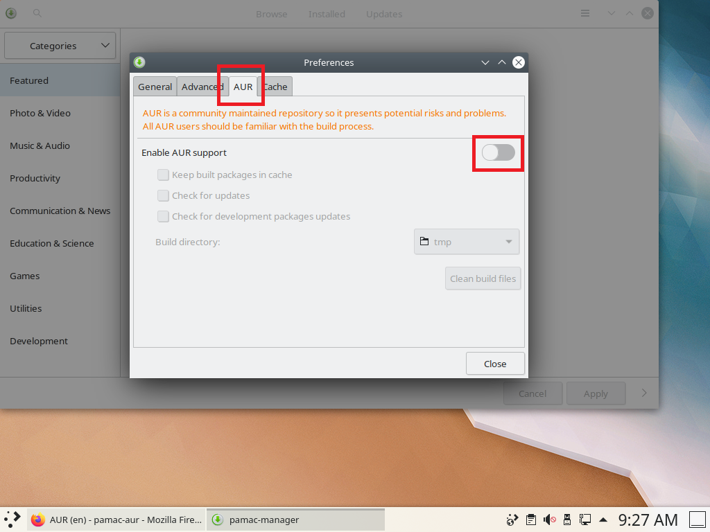 활성화 시키고, 설정창을 닫으면 AUR 사용 설정은 끝이 납니다.
