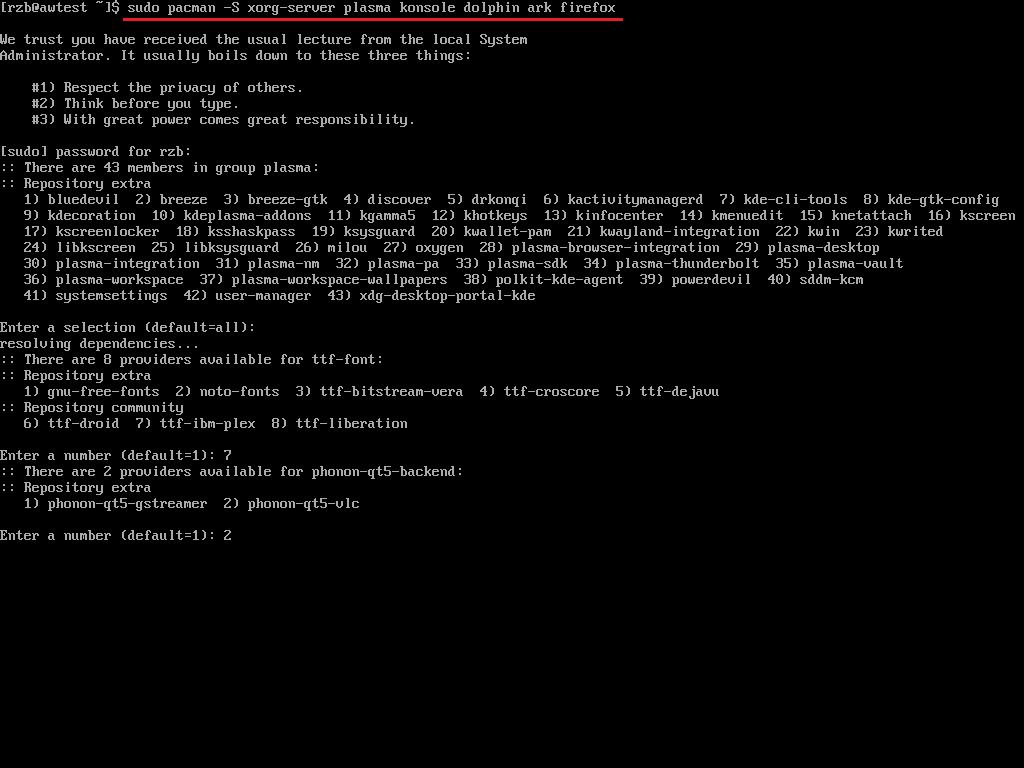 # sudo pacman -S xorg-server plasma(plasma-meta) konsole dolphin ark firefox