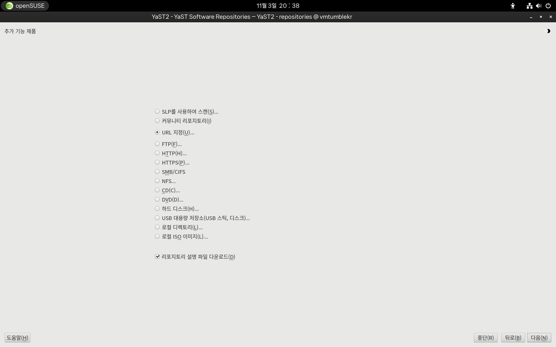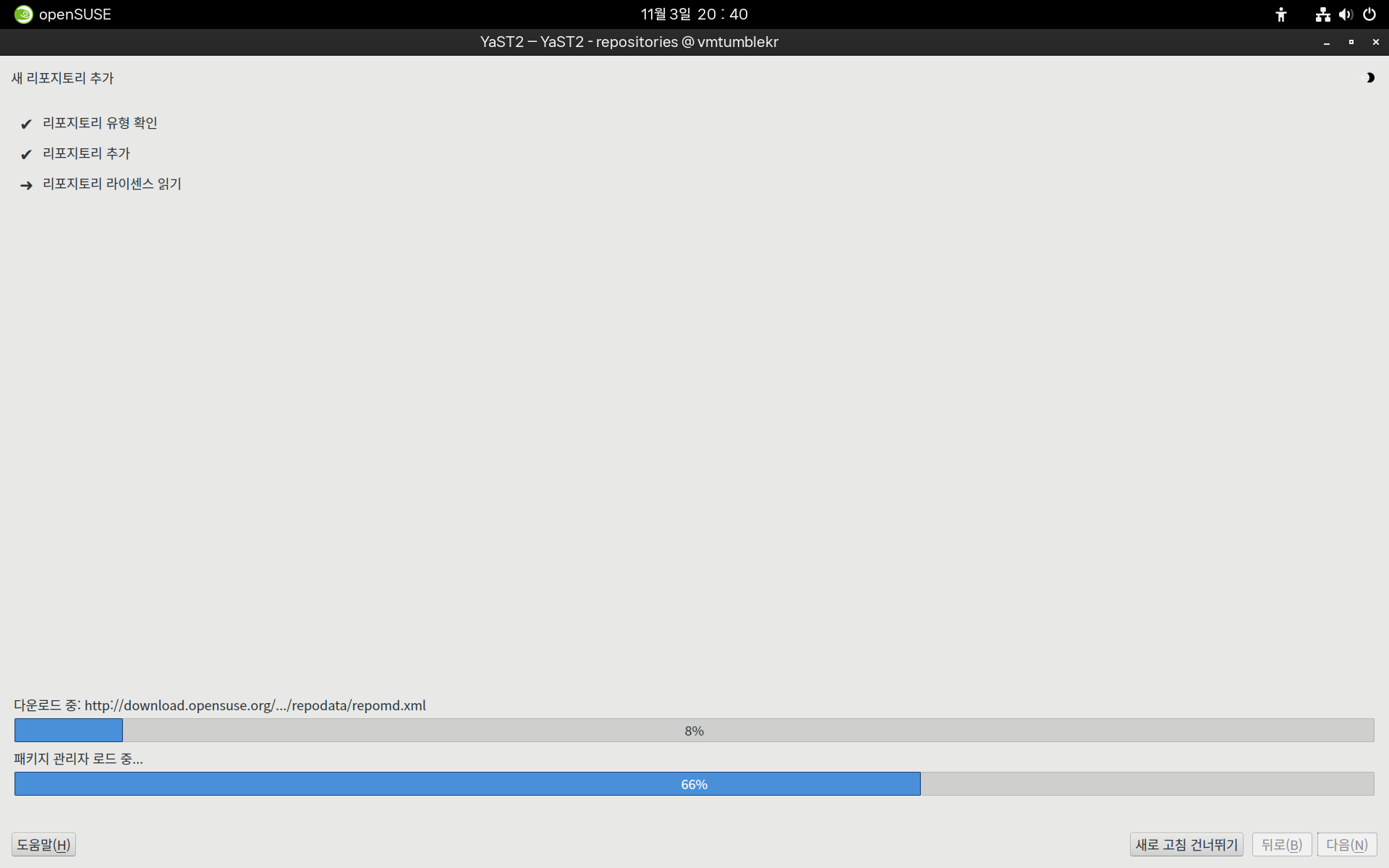 Kaist 미러의 opensuse 페이지에서 저장소를 확인하고 URL을 입력하고 다음을 클릭해 줍니다.