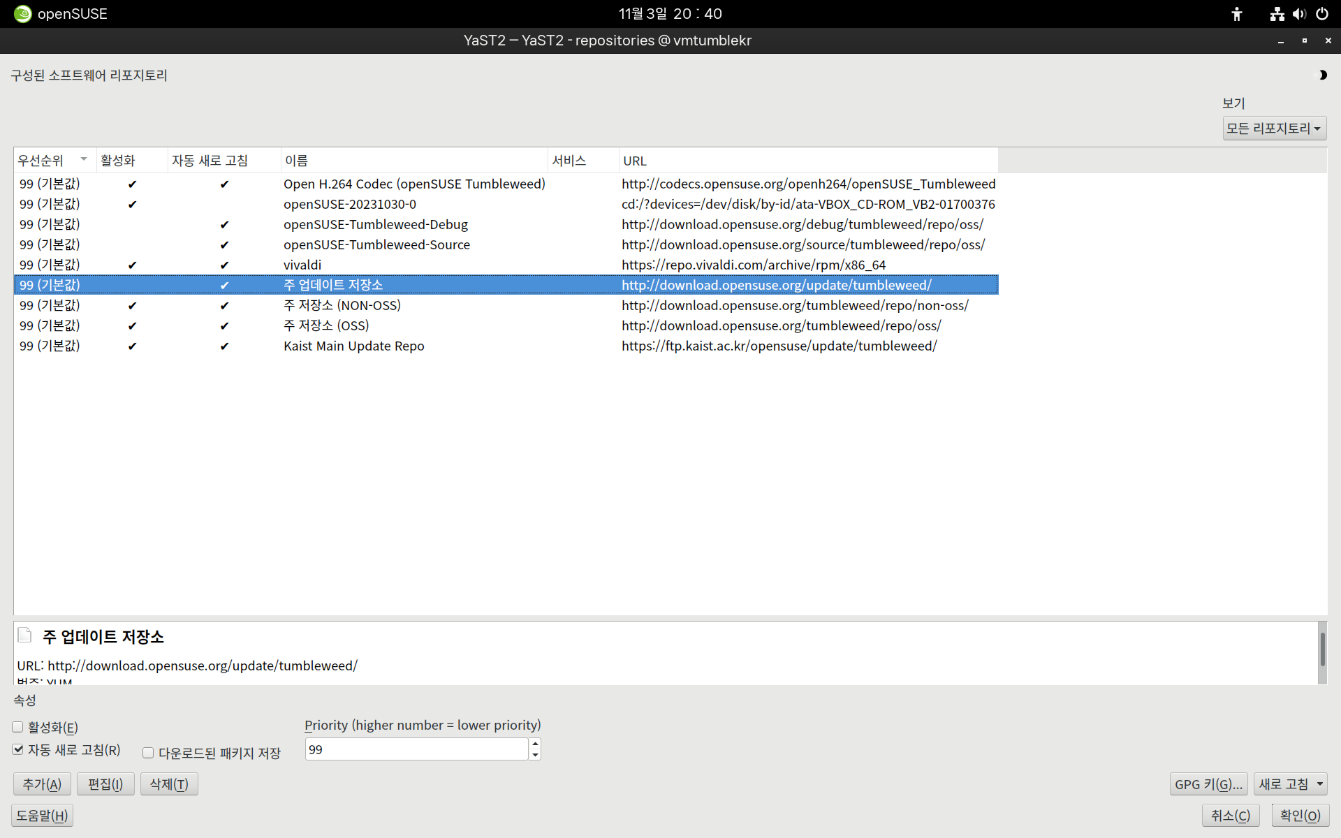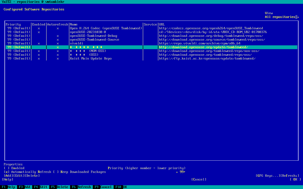 상단 스크린샷에서 확인되는 download.opensuse.org-tumbleweed 를 비활성화 해보겠습니다.