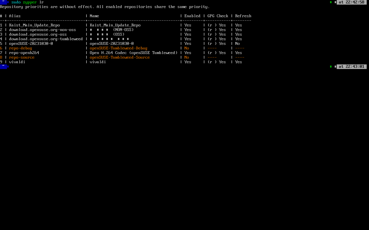 추가 후에 zypper 명령을 통해 패키지를 설치하거나, 소프트웨어 설치를 진행하면 Kaist 저장소에서 패키지를 받아옵니다!