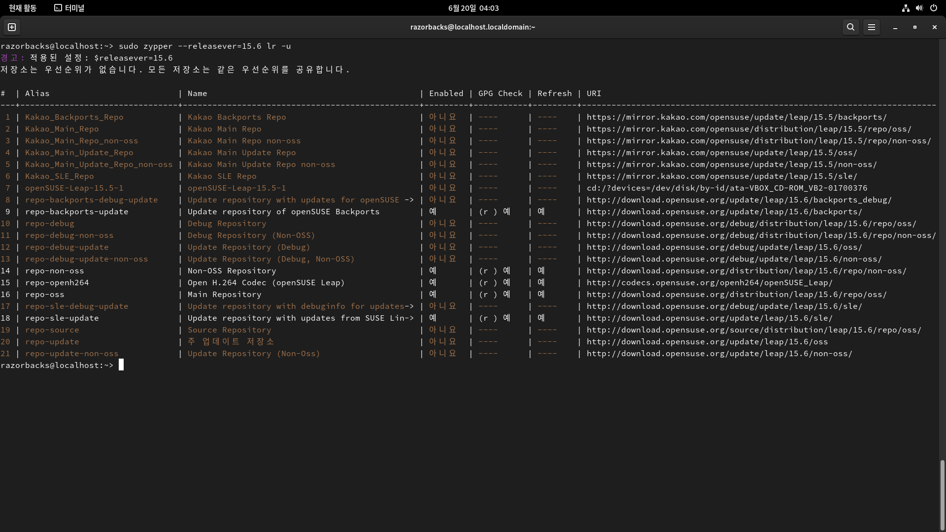 업그레이드 테스트를 진행한 현재 시간(2024년 6월 20일 새벽 2시)에는 카카오 미러 15.6 SLE 저장소 데이터를 정상적으로 불러오지 못하는 현상이 있어 기본 저장소를 이용하는 것이 좋습니다.