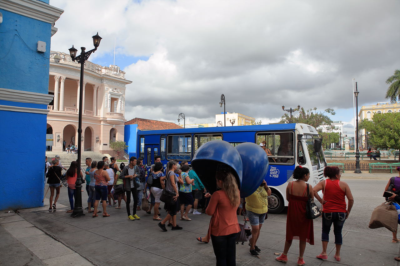 쿠바 사람들이 출퇴근하는 모습을 사진으로 찍어보였다. 우리나라 동네 마을 버스 같은 것인지, 여기에 모여서 우르르 저 버스를 탔다.
