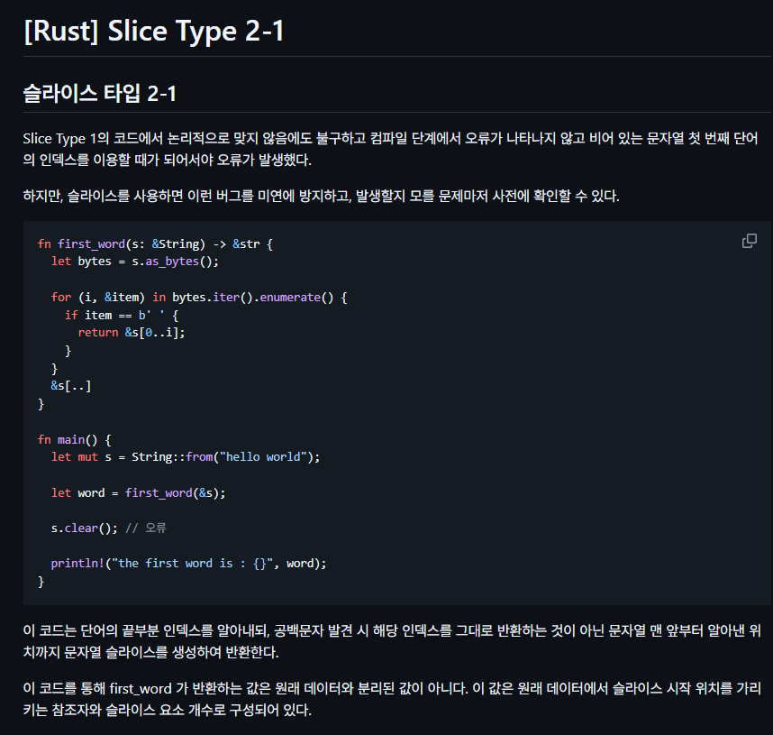 이런 부분에 대한 개념을 아주 조금이라도 알고 있으면 시작하기에 어려움이 없습니다. 저도 아직 고급 과정을 진행하는 것이 아니라서 후반부는 이야기를 못 하겠지만요. 저도 C언어를 포인터 즈음~ 해서 놔버렸는데, 겨우 그만큼 배운 것들이 Rust에 와서도 충분히 도움이 됩니다. Rust에서 이야기하는 타입, 슬라이스 등등과 같은 단어와 개념을 이해할 때 충분합니다.