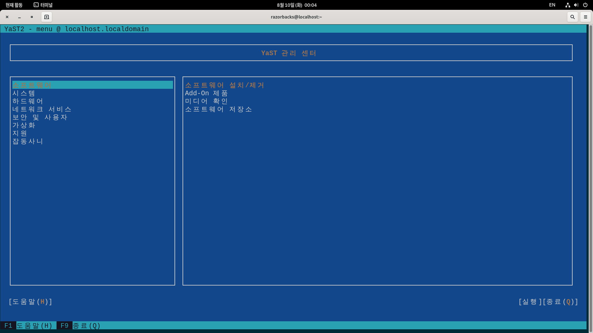 단순히 저장소를 추가하거나, 프로그램을 추가/제거하거나가 끝이 아니라, 보안, 방화벽, 심지어 커널까지 이 YaST 하나만으로 끝낼 수 있습니다. 콘솔을 켤 필요가 있나요?